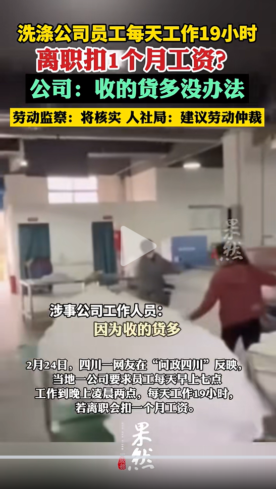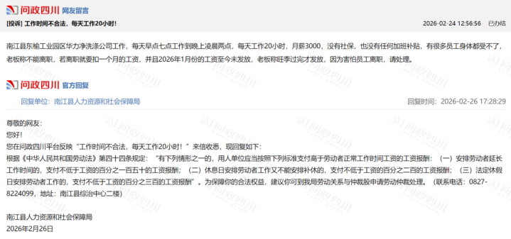 2月24日,四川一网友在“问政四川”反应,当地一公司条件职工每天早上7点责任到晚上凌晨2点,每天责任19小时,若下野会扣一个月工资。网友称月薪3000元,莫得社保。2026年1月份的工资于今未披发,雇主称旺季过完才披发,因为短促职工下野。
