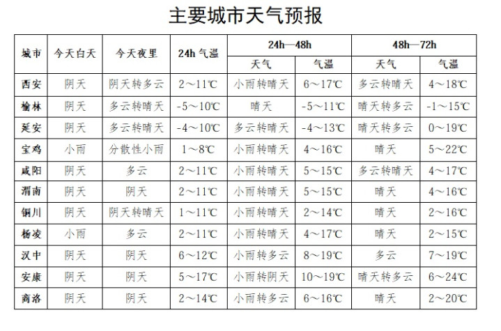 16日:全省阴天,陕北、关中北部、秦岭山区有雨夹雪或小雪,关中南部有小雨,陕南有小到中雨。
