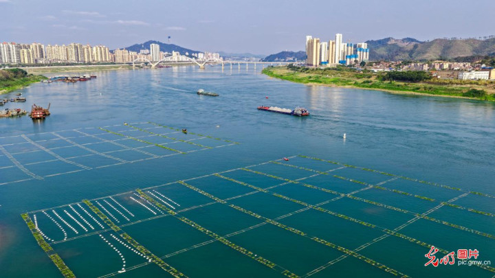 2026年3月7日,在珠江干流西江广西梧州市区段,时代东说念主员驾乘小艇开展江面监测与东说念主工鱼巢管护,助力鱼类春季产卵繁衍。(颜桂海摄/光明图片)